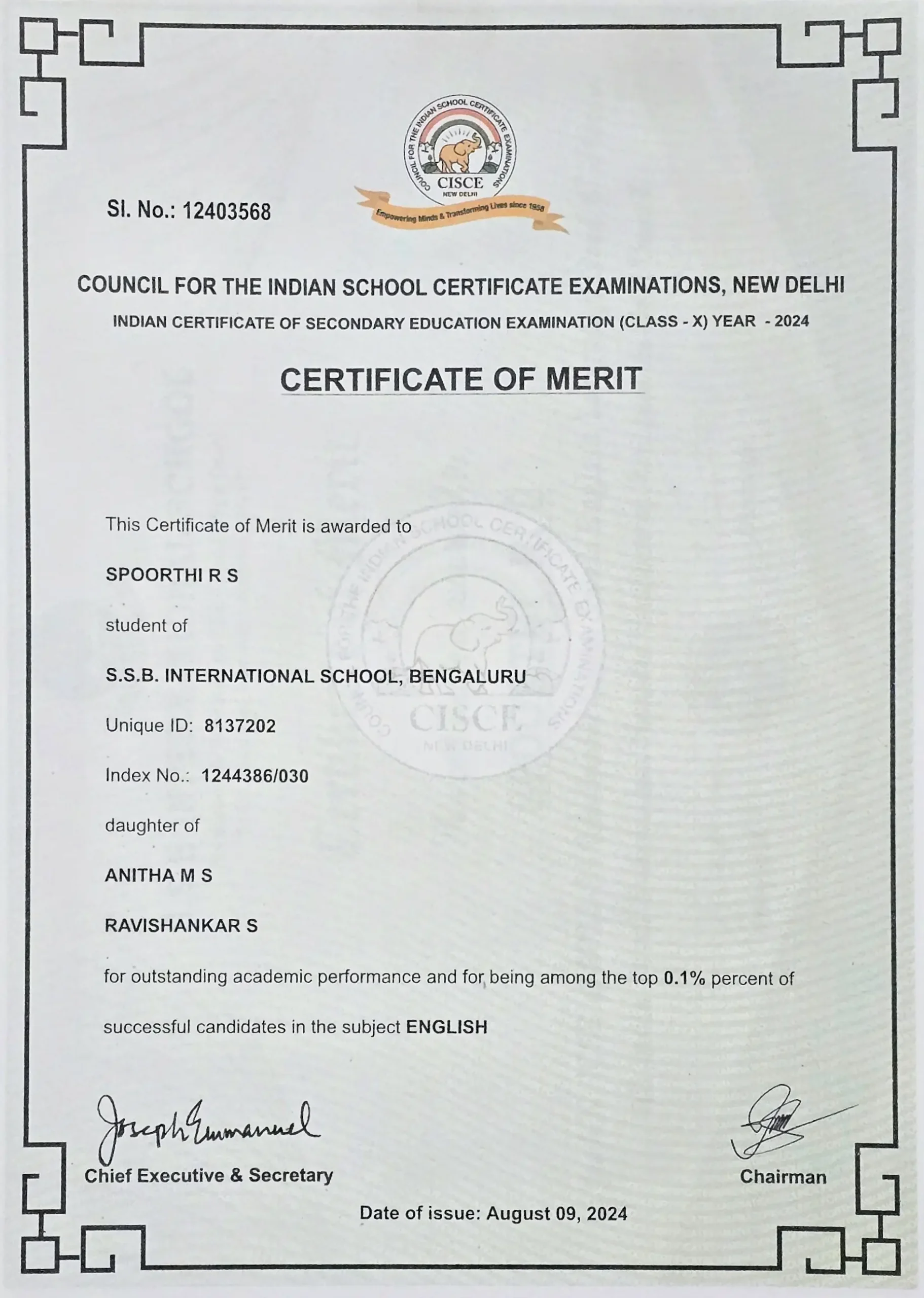 It’s a proud moment for us at SSB International School as our student Spoorthi R. S. has received a meritorious certificate from the Council for the Indian School Certificate Examinations, New Delhi.